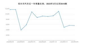 2023年3月,绍兴市汽车总销量为5610辆,同比下降52.06%,环比下降1.42%。2022年03月-2023年03月份,绍兴市总销量为107561辆,同比下降18.32%。在最近1年中,绍兴市销量在2022年03月达到最高,销量为11702辆。