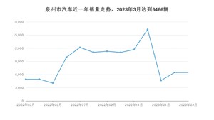2023年3月,泉州市汽车总销量为6466辆,同比增长31.05%,环比持平。2022年03月-2023年03月份,泉州市总销量为115019辆,同比下降16.83%。在最近1年中,泉州市销量在2022年12月达到最高,销量为16281辆。
