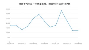 2023年3月,渭南市汽车总销量为1217辆,同比下降29.53%,环比持平。2022年03月-2023年03月份,渭南市总销量为25475辆,同比下降34.97%。在最近1年中,渭南市销量在2022年12月达到最高,销量为3325辆。