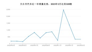 2023年3月,天水市汽车总销量为328辆,同比增长76.34%,环比持平。2022年03月-2023年03月份,天水市总销量为8715辆,同比下降49.15%。在最近1年中,天水市销量在2022年12月达到最高,销量为2466辆。