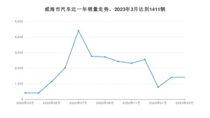 2023年3月,威海市汽车总销量为1411辆,同比增长248.4%,环比持平。2022年03月-2023年03月份,威海市总销量为24743辆,同比下降42.85%。在最近1年中,威海市销量在2022年07月达到最高,销量为4404辆。
