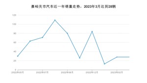 2023年3月,嘉峪关市汽车总销量为28辆,环比持平。2022年03月-2023年03月份,嘉峪关市总销量为532辆,同比下降83.27%。在最近1年中,嘉峪关市销量在2022年08月达到最高,销量为109辆。