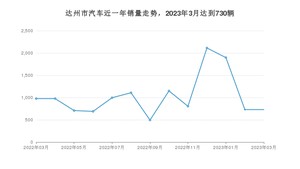 2023年3月,达州市汽车总销量为730辆,同比下降25.28%,环比持平。2022年03月-2023年03月份,达州市总销量为13375辆,同比下降55.02%。在最近1年中,达州市销量在2022年12月达到最高,销量为2113辆。
