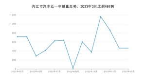 2023年3月,内江市汽车总销量为461辆,同比下降35.52%,环比持平。2022年03月-2023年03月份,内江市总销量为7329辆,同比下降58.66%。在最近1年中,内江市销量在2022年12月达到最高,销量为1163辆。