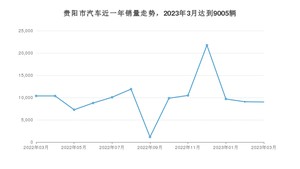 2023年3月,贵阳市汽车总销量为9005辆,同比下降13.13%,环比下降0.55%。2022年03月-2023年03月份,贵阳市总销量为129686辆,同比下降20.23%。在最近1年中,贵阳市销量在2022年12月达到最高,销量为21743辆。
