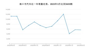 2023年3月,海口市汽车总销量为5655辆,同比下降49.66%,环比下降1.41%。2022年03月-2023年03月份,海口市总销量为102620辆,同比下降34.2%。在最近1年中,海口市销量在2022年12月达到最高,销量为12061辆。