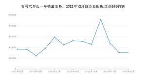 在国内市场上,吉利汽车,在2023年3月的销量为30281辆,同比下降16.69%,环比增长0.16%。2022年03月-2023年03月份,吉利汽车累计销量为587389辆,较去年同期下降36.19%。