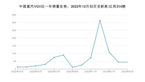 在国内市场上,中国重汽VGV,在2023年3月的销量为44辆,同比增长238.46%,环比持平。2022年03月-2023年03月份,中国重汽VGV累计销量为860辆,较去年同期下降86.03%。