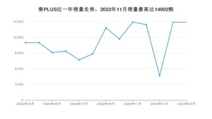 2023年3月,秦PLUS销量为14886辆,同比增长35.6%,环比增长0.07%。2022年03月-2023年03月份,秦PLUS销量为146137辆,同比下降6.93%。