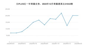 2023年3月,元PLUS销量为20134辆,同比增长192.52%,环比持平。2022年03月-2023年03月份,元PLUS销量为187043辆,同比增长2%。