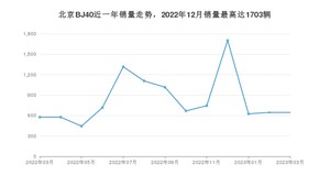 2023年3月,北京BJ40销量为645辆,同比增长11.79%,环比持平。2022年03月-2023年03月份,北京BJ40销量为10784辆,同比下降54.71%。