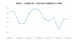 2023年3月,威霆销量为730辆,同比下降30.54%,环比持平。2022年03月-2023年03月份,威霆销量为10500辆,同比下降45.93%。