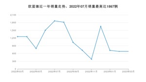 2023年3月,欧蓝德销量为683辆,同比下降45.62%,环比持平。2022年03月-2023年03月份,欧蓝德销量为14378辆,同比下降73%。
