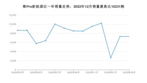 2023年3月,秦Pro新能源销量为7314辆,同比下降15.52%,环比持平。2022年03月-2023年03月份,秦Pro新能源销量为102639辆,同比增长1%。