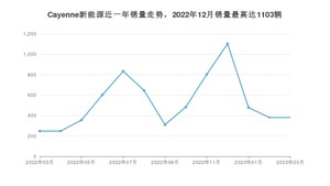 2023年3月,Cayenne新能源销量为381辆,同比增长53.63%,环比持平。2022年03月-2023年03月份,Cayenne新能源销量为6873辆,同比增长583.2%。