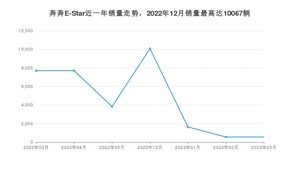 2023年3月,奔奔E-Star销量为553辆,同比下降92.81%,环比持平。2022年03月-2023年03月份,奔奔E-Star销量为32025辆,同比下降64.23%。