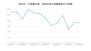 2023年3月,悦动销量为1094辆,同比下降33.86%,环比增长1.02%。2022年03月-2023年03月份,悦动销量为17204辆,同比下降52.77%。