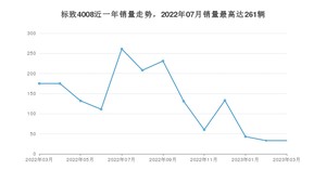 2023年3月,标致4008销量为33辆,同比下降81.14%,环比持平。2022年03月-2023年03月份,标致4008销量为1726辆,同比下降78.3%。