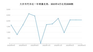 2023年4月,大庆市汽车总销量为2088辆,同比增长28.49%,环比持平。2022年04月-2023年04月份,大庆市总销量为22038辆,同比下降35.02%。在最近1年中,大庆市销量在2022年07月达到最高,销量为2627辆。