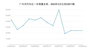 2023年4月,广州市汽车总销量为23971辆,同比下降43.29%,环比持平。2022年04月-2023年04月份,广州市总销量为454040辆,同比下降20.18%。在最近1年中,广州市销量在2022年12月达到最高,销量为59402辆。