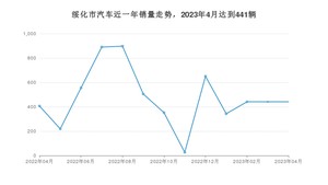 2023年4月,绥化市汽车总销量为441辆,同比增长8.62%,环比持平。2022年04月-2023年04月份,绥化市总销量为6167辆,同比下降49.01%。在最近1年中,绥化市销量在2022年08月达到最高,销量为897辆。