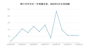 2023年4月,铜川市汽车总销量为56辆,同比增长300%,环比持平。2022年04月-2023年04月份,铜川市总销量为1127辆,同比下降70.09%。在最近1年中,铜川市销量在2022年12月达到最高,销量为235辆。