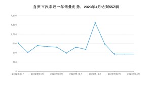 2023年4月,自贡市汽车总销量为557辆,同比下降38.86%,环比持平。2022年04月-2023年04月份,自贡市总销量为10126辆,同比下降49.99%。在最近1年中,自贡市销量在2022年12月达到最高,销量为1569辆。