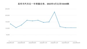 2023年4月,昆明市汽车总销量为10448辆,同比下降22.08%,环比持平。2022年04月-2023年04月份,昆明市总销量为179256辆,同比下降22.8%。在最近1年中,昆明市销量在2022年12月达到最高,销量为22595辆。
