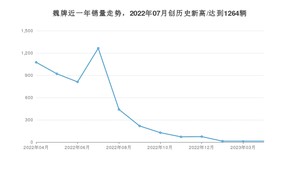 在国内市场上,魏牌,在2023年4月的销量为13辆,同比下降98.79%,环比持平。2022年04月-2023年04月份,魏牌累计销量为5038辆,较去年同期下降74.49%。