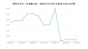 在国内市场上,零跑汽车,在2023年4月的销量为730辆,同比下降89.72%,环比持平。2022年04月-2023年04月份,零跑汽车累计销量为78820辆,较去年同期增长22.48%。