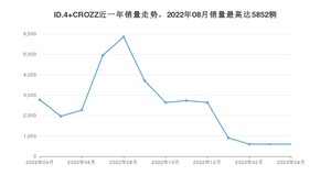 2023年4月,ID.4 CROZZ销量为600辆,同比下降78.35%,环比持平。2022年04月-2023年04月份,ID.4 CROZZ销量为32225辆,同比增长2.62%。