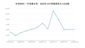 2023年4月,哈弗M6销量为4146辆,同比增长31.37%,环比持平。2022年04月-2023年04月份,哈弗M6销量为62929辆,同比下降43.9%。