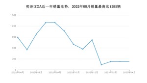 2023年4月,奕泽IZOA销量为226辆,同比下降74.61%,环比持平。2022年04月-2023年04月份,奕泽IZOA销量为8974辆,同比下降74.24%。