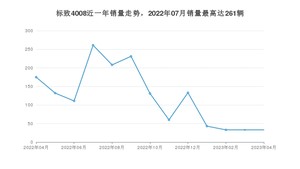 2023年4月,标致4008销量为33辆,同比下降81.14%,环比持平。2022年04月-2023年04月份,标致4008销量为1584辆,同比下降78.94%。