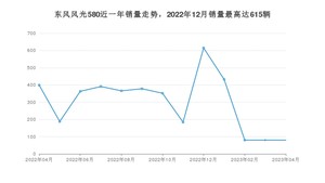 2023年4月,东风风光580销量为80辆,同比下降79.95%,环比持平。2022年04月-2023年04月份,东风风光580销量为3908辆,同比下降81.19%。