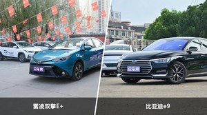 以热销车型进行对比,雷凌双擎E+采用了一套由1.8L L4 99马力自然吸气+电机组成的混合动力系统,比亚迪e9搭载一台永磁/同步电机。