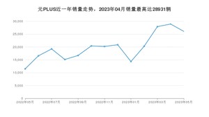 2023年5月,元PLUS销量为26072辆,同比增长126.71%,环比下降9.88%。2022年05月-2023年05月份,元PLUS销量为258140辆,同比增长577.34%。