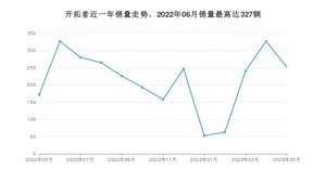 2023年5月,开拓者销量为252辆,同比增长46.51%,环比下降22.94%。2022年05月-2023年05月份,开拓者销量为2803辆,同比下降57.76%。