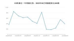 2023年5月,K5凯酷销量为383辆,同比增长4.08%,环比下降30.62%。2022年05月-2023年05月份,K5凯酷销量为6444辆,同比下降47.03%。