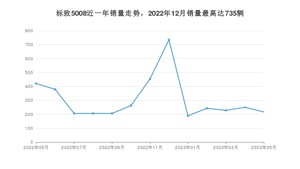 2023年5月,标致5008销量为217辆,同比下降48.46%,环比下降13.2%。2022年05月-2023年05月份,标致5008销量为3997辆,同比下降36.59%。
