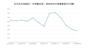2023年5月,东风风光S560销量为269辆,同比下降49.25%,环比下降13.5%。2022年05月-2023年05月份,东风风光S560销量为6520辆,同比下降52.23%。