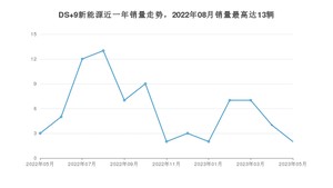 2023年5月,DS 9新能源销量为2辆,同比下降33.33%,环比下降50%。2022年05月-2023年05月份,DS 9新能源销量为76辆,同比下降21.65%。