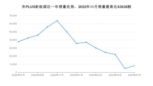 2023年7月,宋PLUS新能源销量为8341辆,同比下降77.92%,环比增长79.3%。2022年07月-2023年07月份,宋PLUS新能源销量为458393辆,同比增长61.14%。