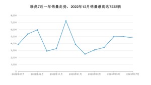 2023年7月,瑞虎7销量为4799辆,同比增长24.01%,环比下降3.79%。2022年07月-2023年07月份,瑞虎7销量为56200辆,同比增长6.03%。