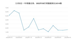 2023年7月,几何E销量为1591辆,同比下降69.23%,环比增长8.23%。2022年07月-2023年07月份,几何E销量为36961辆,同比增长301.58%。