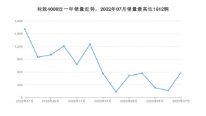 2023年7月,标致4008销量为599辆,同比下降62.84%,环比增长263.03%。2022年07月-2023年07月份,标致4008销量为9595辆,同比下降35.7%。