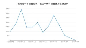 2023年7月,悦动销量为16辆,同比下降98.43%,环比下降93.87%。2022年07月-2023年07月份,悦动销量为18841辆,同比下降36.24%。