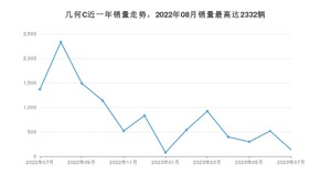 2023年7月,几何C销量为136辆,同比下降90.04%,环比下降73.75%。2022年07月-2023年07月份,几何C销量为10570辆,同比下降25.81%。