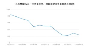 2023年7月,风光MINIEV销量为236辆,同比下降71.8%,环比下降18.9%。2022年07月-2023年07月份,风光MINIEV销量为6345辆,同比增长76.05%。