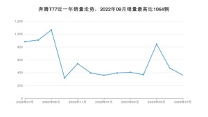 2023年7月,奔腾T77销量为361辆,同比下降59.12%,环比下降23.35%。2022年07月-2023年07月份,奔腾T77销量为7317辆,同比下降49.5%。